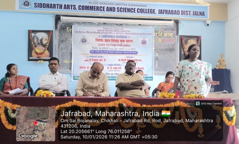 जाफराबाद येथील सिद्धार्थ कला,वाणिज्य व विज्ञान महाविद्यालयात बालविवाह मुक्त भारत प्रबोधन कार्यक्रम घेण्यात आला. कार्यक्रमाच्या अध्यक्षस्थानी महाविद्यालयाचे प्राचार्य डॉ.रमेश देशमुख हे होते तर प्रमुख वक्ते श्रीमती एन.बी.खांडेभराड यांचे मार्गदर्शन लाभले. विचार मंचावर महाविद्यालयाचे उपप्राचार्य प्रो.डॉ. सुनील मेढे उपप्राचार्य डॉ.श्याम सर्जे यांची प्रमुख उपस्थिती होती. सदर कार्यक्रमाचे आयोजन महिला विकास कक्ष, लैंगिक छळ प्रतिबंध समिती, सखी सावित्री समिती तसेच मा. राष्ट्रीय विधी सेवा प्राधिकरण नवी दिल्ली यांच्या संयुक्त विद्यमाने आयोजित केला होता. यावेळी प्रमुख वक्त्यांनी बालविवाह प्रतिबंधक कायदा 2006 पूर्वी भारतातील हिंदू विवाह कायद्या अंतर्गत मुलीचे वय 18 वर्ष व मुलाचे वय 21 वर्ष पूर्ण झाल्याशिवाय विवाह संमती नव्हती परंतु काही पालक आपल्या मुलांचे बालविवाह लावून देत त्यामुळे बालविवाहाचे दुष्परिणाम समाजात दिसू लागले मुलींच्या आरोग्यावर परिणाम, शिक्षणावर परिणाम तिची शारीरिक, मानसिक आणि बौद्धिक जडणघडण व्यवस्थित न झाल्यामुळे आरोग्यावर सुद्धा परिणाम होत होते. त्यामुळे हिंदू विवाह कायदा 1955 यामध्ये सुधारणा करून बालविवाह प्रतिबंधक कायदा 2006 भारतात सक्तीने लागू करण्यात आला. बालविवाह करणाऱ्या माता,पिता तसेच या विवाह साठी उपस्थित फोटोग्राफर असेल, पत्रिका छपाई करणारा असेल, विवाह साठी उपस्थित असणारे यांच्यावर कायदेशीर कारवाई करण्याचे प्रावधान करण्यात आले आहे. त्यामुळे येत्या काळात बालविवाह मुक्त भारत करण्याचे सरकारचे धोरण आहे असे सांगितले.यावेळी उपप्राचार्य डॉ.श्याम सर्जे यांनीही बालविवाह मुक्त भारत या विषयावर मार्गदर्शन केले.अध्यक्षीय समारोपात प्राचार्य डॉ.रमेश देशमुख यांनी बालविवाह रोखण्यासाठी भारत सरकारने निर्माण केलेले बालविवाह प्रतिबंधक कायदे तंतोतंत लागू करण्यासाठी ग्रामपातळीवर ग्रामसेवक,सरपंच,अंगणवाडी सेविका,बालविवाह प्रकल्प अधिकारी तसेच जागृत नागरिकांनी सजग राहणे आवश्यक असल्याचे सांगितले. आपल्या परिसरात किंवा अवतीभवती जर बालविवाह आढळून आला तर चाइल्ड हेल्पलाइन 1098 या हेल्पलाइनवर संपर्क साधने किंवा पोलीस प्रशासनास कळविणे तसेच तालुका बाल संरक्षण समिती,गाव बाल संरक्षण समिती यांच्याशी संपर्क साधण्याचे आवाहन केले.यावेळी महाविद्यालयातील विद्यार्थ्यांनी बालविवाह मुक्त भारत पोस्टर्स स्पर्धेचे आयोजन करण्यात आले होते त्यात कु.समिक्षा सदानंद हिवाळे (प्रथम) अभिषेक संतोष भारती(द्वितीय)कु.पायल स़ंतोष सोनुने(तृतीय) तर कु.आरती विष्णू इंगळे या विद्यार्थ्यांनीच्या चित्रकलेस उत्तेजनार्थ क्रमांक मिळाला.सदरील चित्रकला स्पर्ध